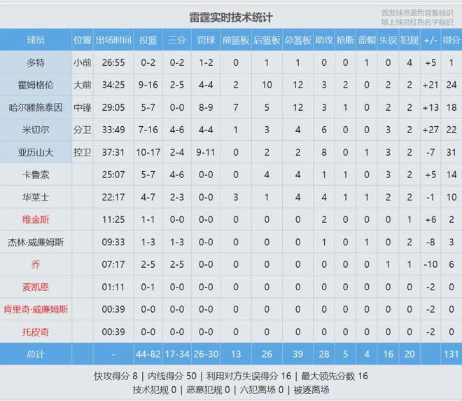 雷霆球员亚历山大此役17投10中,三分4中2,罚球11中9,得到31分2篮板8助攻1盖帽。季后赛首轮,亚历山大一共打了143分钟,砍下135分!他首轮场均得到33.8分3.8篮板8助攻2.3失误,投篮命中率55.1%,场均12.2次罚球出手。